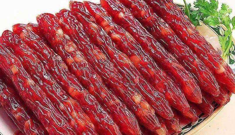 材料:猪肠衣、猪肉、盐、料酒、香料粉、胡椒粉、花椒面、味精、白糖、火硝。