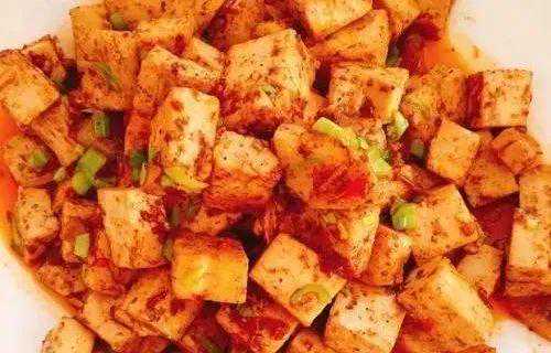 1.豆腐切丁或片,炸金黄,锅烧热,下白糖炒红,加热水,豆腐,盐,料酒,收汁,盛出放凉。
