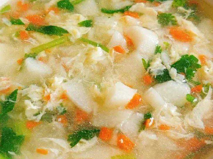 5.起锅烧猪油、下姜葱炒香,加水,调入盐、胡椒、料酒、味精、再打去姜葱不用。