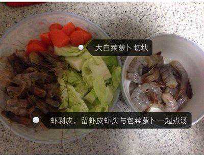 1.胡萝卜包菜切大块,鲜虾剥皮,留虾头虾皮与胡萝卜包菜一起放进白水煮汤底。