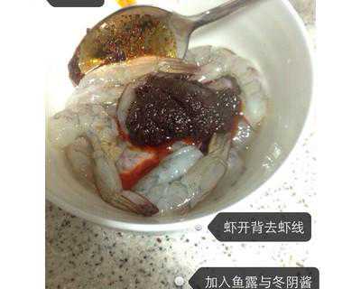 2.处理虾:煮汤期间,将虾开背去虾线。加入鱼露与冬阴酱。