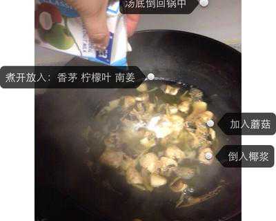5.汤底倒回锅中,煮开放入香茅,柠檬叶和南姜。煮出香味放蘑菇。倒入一半椰浆。