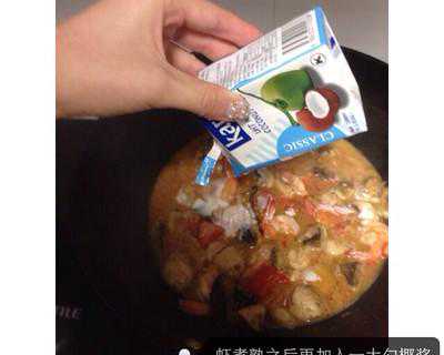 6.稍煮片刻,加入处理好的虾,泰椒和番茄。虾煮至变色倒入另外一半椰奶。
