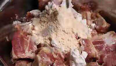 2、排骨腌制·排骨码上味精、盐、蔬菜碎(香菜、芹菜、大葱、胡萝卜、姜、蒜洗净后用料理机打成茸,挤出水分)搅拌均匀,腌制片刻;腌制好的排骨去掉蔬菜碎,加上生粉、吉士粉蛋清一个,搅拌均匀备用;