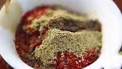 3、第三步·炸茄子·四成油温,茄子下锅油炸,炸至成熟,沥油捞出备用;第四步·茄子调味·制作烧烤酱:盐、味精、辣椒面、花椒面。孜然粉,用油烫熟搅拌均匀;