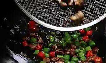 6、炒制·辣椒切成小段,过油捞出备用;锅内放少许油,依次加入蒜蓉、胡豆,炸好的辣椒、排骨,撒入适量味精和盐,迅速翻炒几下,出锅,码在制作好的茄子上,撒上少许白芝麻,即成;