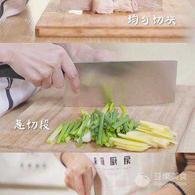 1、五花肉煮至断生后捞出,均匀切块。姜和莲藕切片,葱切成段。