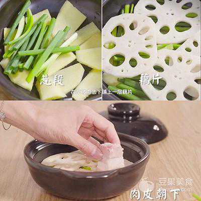 2、在砂锅底部依次码好一层姜片、一层葱段、一层藕片,再将切好的五花肉皮朝下整齐码在上面。