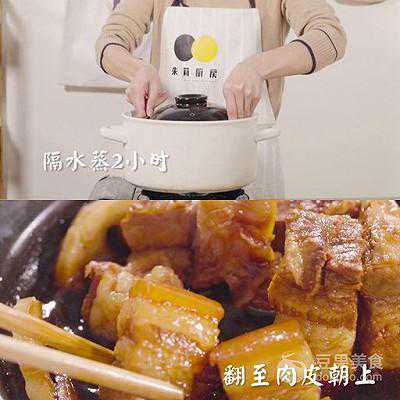 4、将砂锅放入大蒸锅,隔水蒸两个小时。蒸好后,将肉翻面至肉皮朝上。