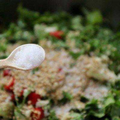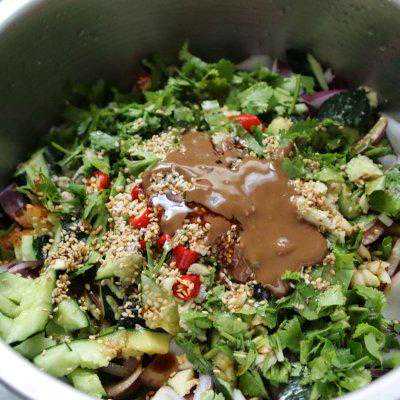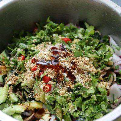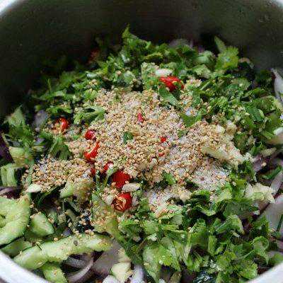 4、加入切好的葱花,香菜,熟芝麻,小米辣和白糖