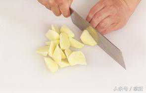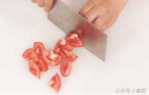 4洗好的西红柿对半切开,去蒂,切滚刀块。
