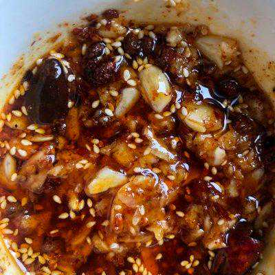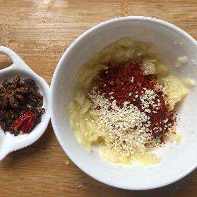 4、给大家推荐一款万能凉拌调料汁:一头大蒜拍碎,捣成蒜泥,放入一勺干辣椒面,白芝麻,鸡精少许,花椒粉少许。锅内起油,有微热放入八角,桂皮,花椒,等,葱段,香菜等,炸出香味,捞出大料,油微微凉一分钟,倒入蒜蓉碗中,这样做出的辣椒油色泽红亮,不暗沉,加入盐,搅拌均匀放入凉菜中,随便调什么凉菜都可以。