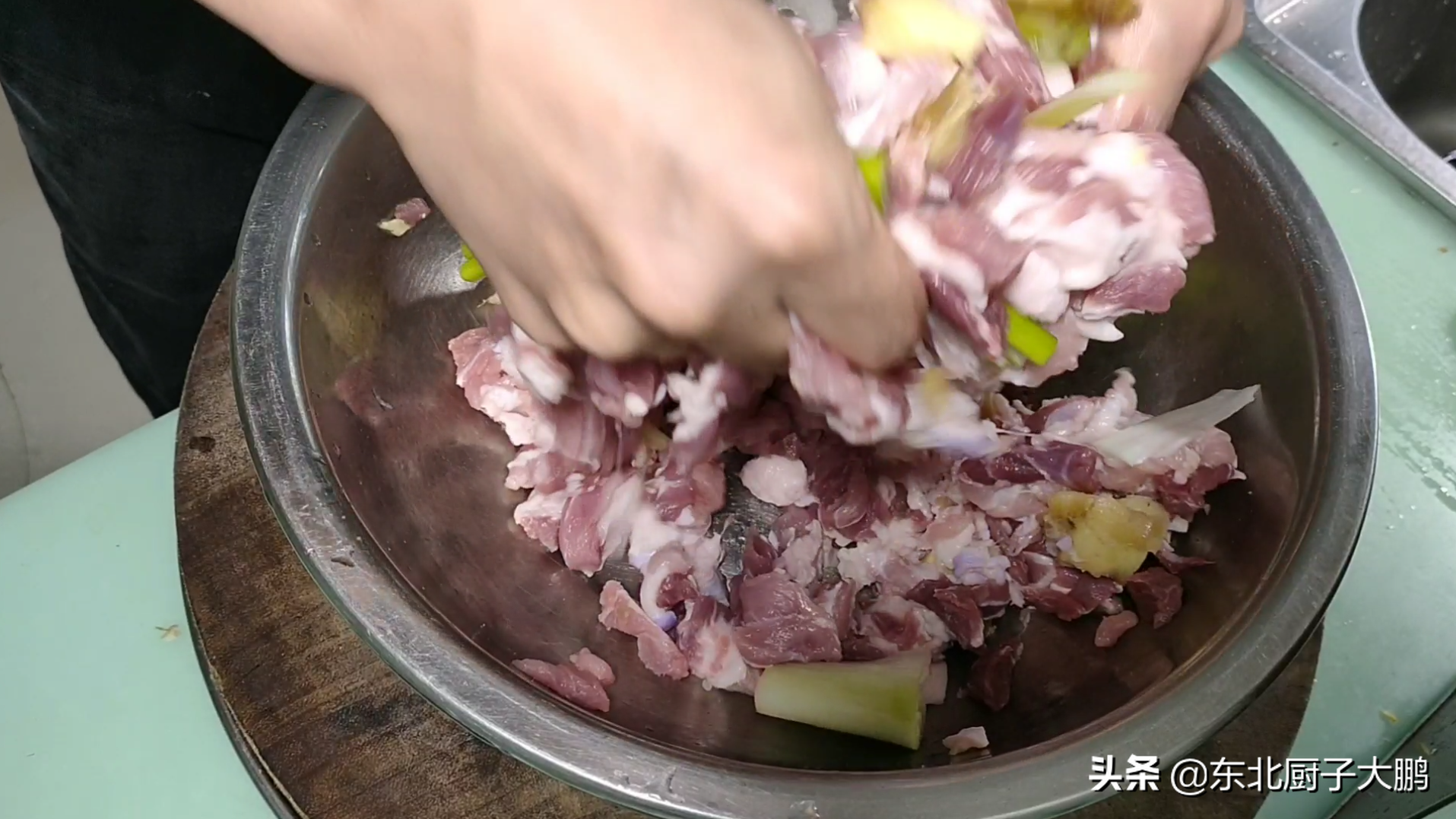 6.将拍好的葱姜,放入肉里,用力抓拌5分钟,腌制30分钟。