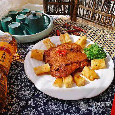 7、烧至汤汁浓稠,鱼肉入味,可出锅,捡去葱、八角、香叶等,摆盘。