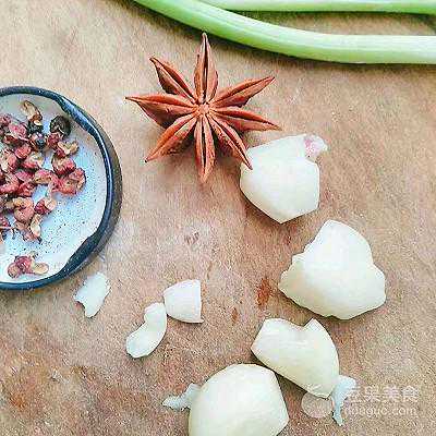 5、放入香叶、八角、姜片、蒜瓣、干辣椒煸香。