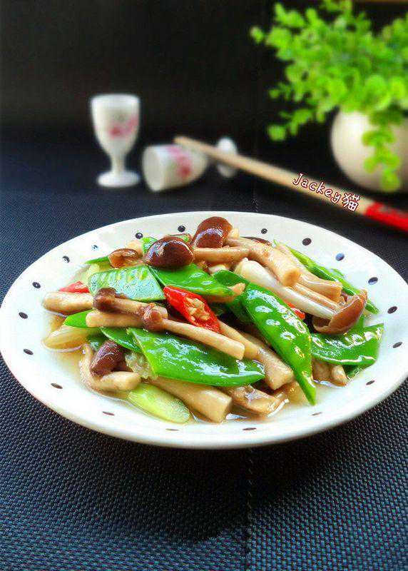 2.茶树菇切段,荷兰豆对半切开,入开水锅中焯烫至断生