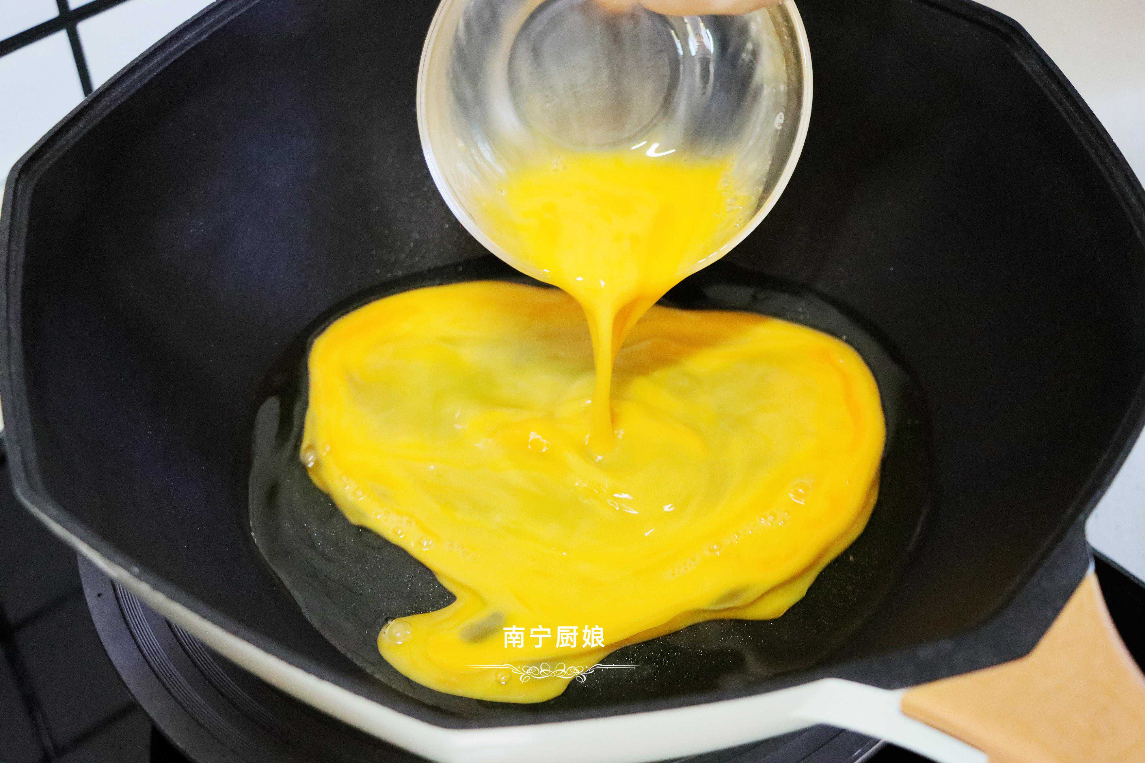 第二步:起锅,在锅中倒入适量的油,开中火烧热锅中油,锅中油烧热后倒入鸡蛋液,等锅中鸡蛋液开始凝固时,再翻动翻炒成块,出锅盛出装碗待用。