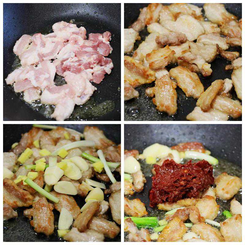 第三步:重新起锅,之前炒鸡蛋的余油不用倒掉,继续用小火烧热锅中的油,把五花肉片倒入锅中,干煸至表面微微焦黄,再倒入葱姜蒜一起爆香,接着再放入1勺豆瓣酱一起翻炒均匀。