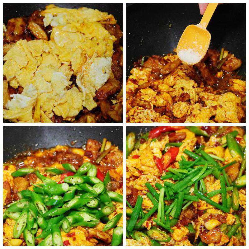 第四步:把之前炒好的鸡蛋块倒入锅中一起翻炒均匀,接着倒入1半勺蚝油,小半勺白糖翻炒均匀,再倒入青红椒段大火翻炒30秒,最后放入葱段即可出锅。