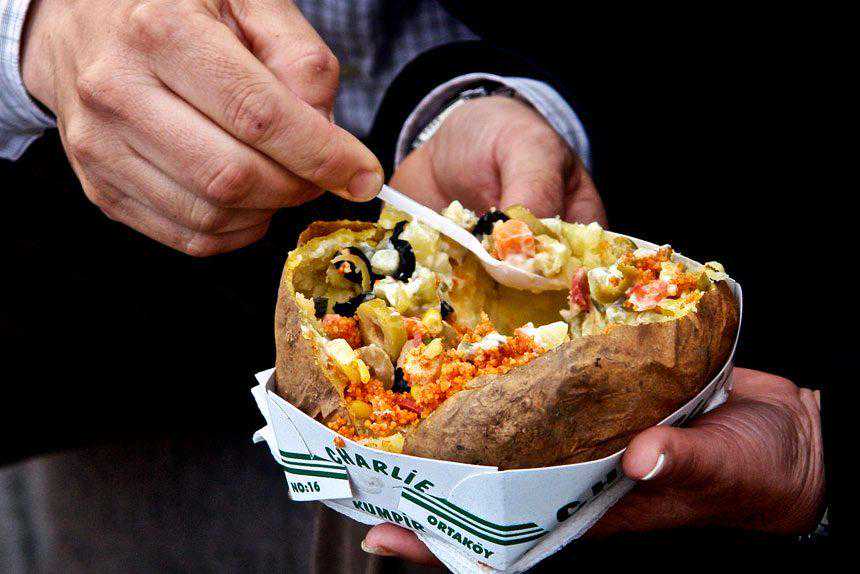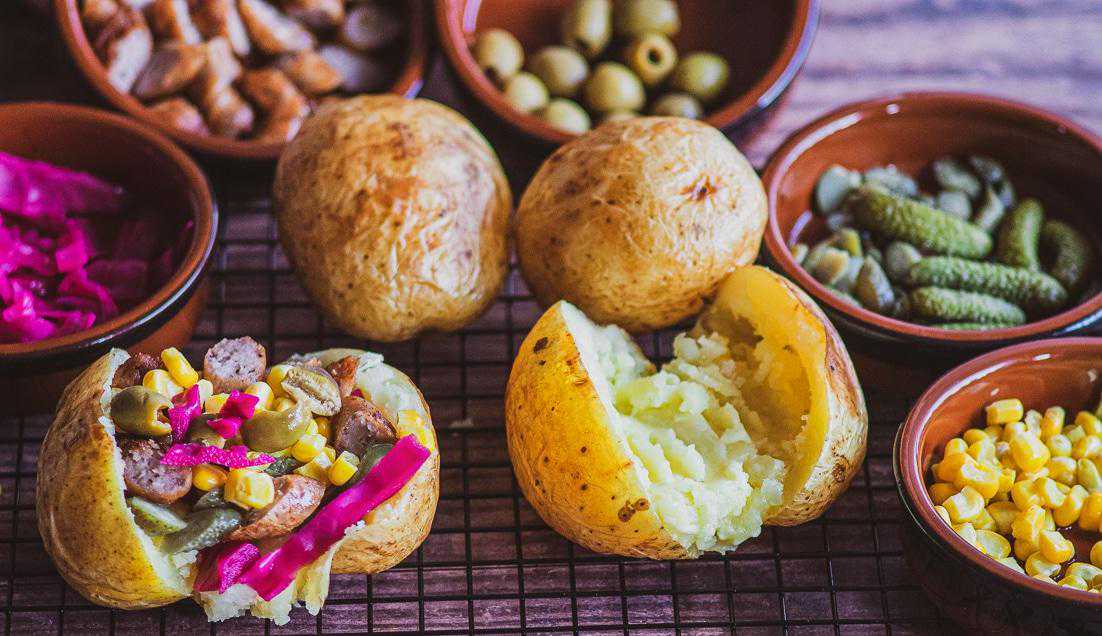 它是用整个土豆烤制而成,从中间切开后,夹上土豆泥、黄油和卡萨尔奶酪,它的馅料可能还包括蛋黄酱或番茄酱、新鲜或腌制的蔬菜、沙拉和香肠等等。