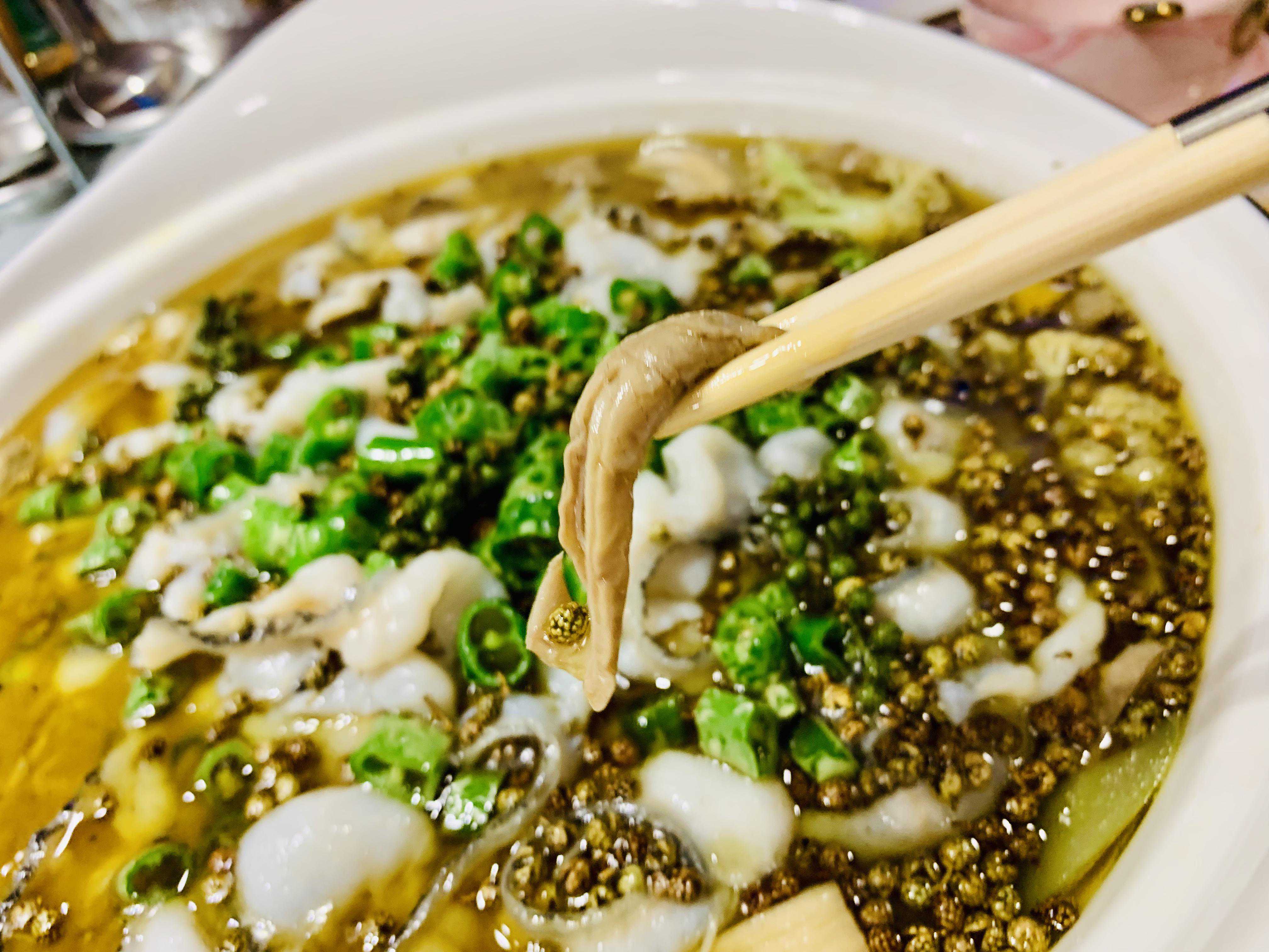 雪白的鱼肉,薄薄一片,微微透明,灯光下,晶莹剔透,十分入味、微麻微辣,咸鲜爽口,又滑又嫩,唯一不足之处,有些鱼片还有鱼骨。