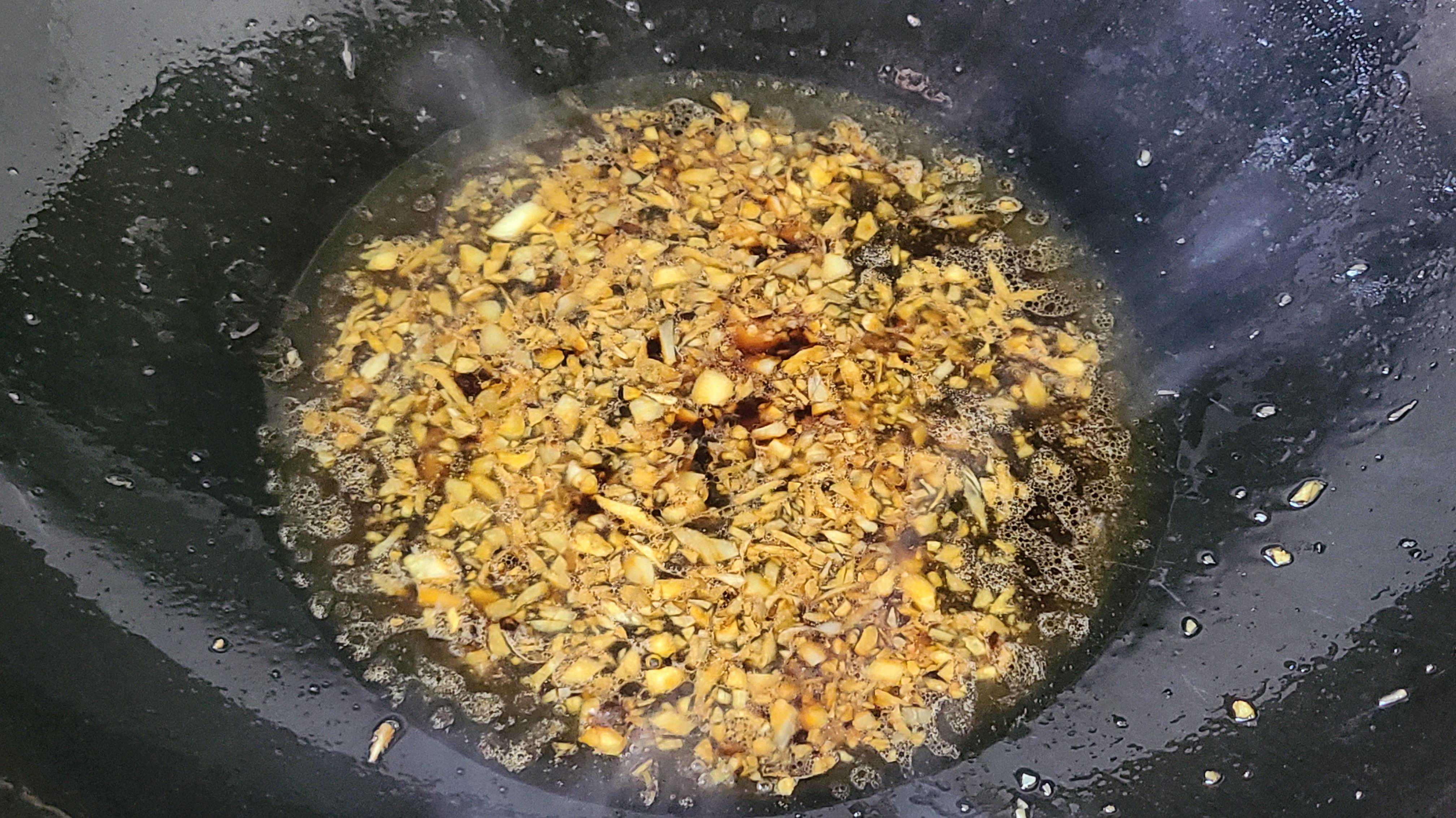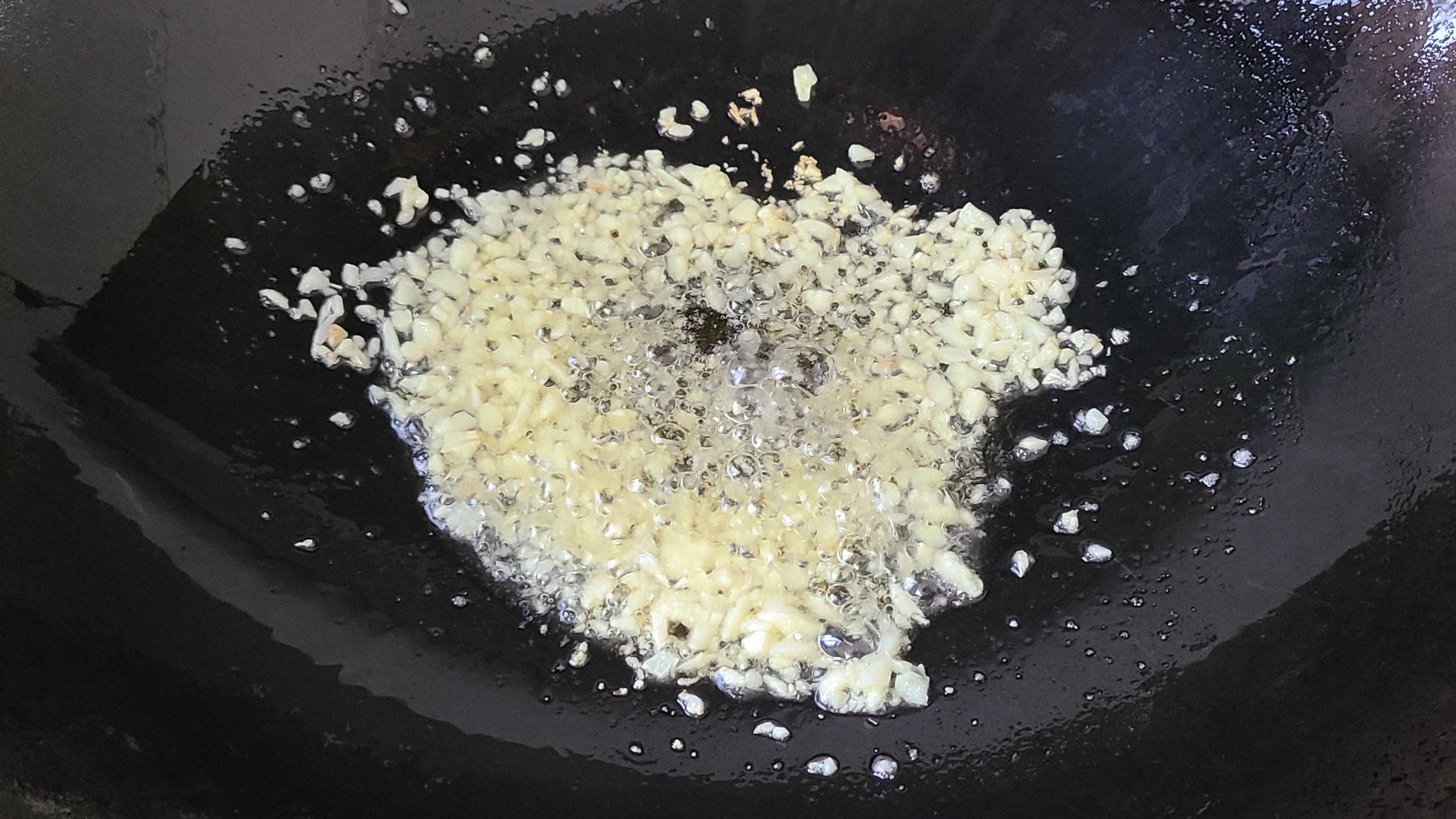3.锅里放入适量的花生油,把剁好的大蒜放进去开小火炒香,香味出来之后,倒入一碗清水,然后来调一下味。锅里倒入一勺生抽、一勺蚝油,把它稍微搅拌一下,让调料化开,不要放盐了,因为生抽跟蚝油都有咸味了。锅里的调料烧开之后就可以关火出锅了。