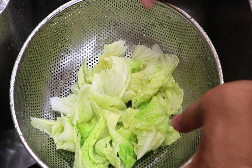 几片大白菜,我们只要菜叶不要菜帮,把白菜也用手撕开,放入清水中洗干净。