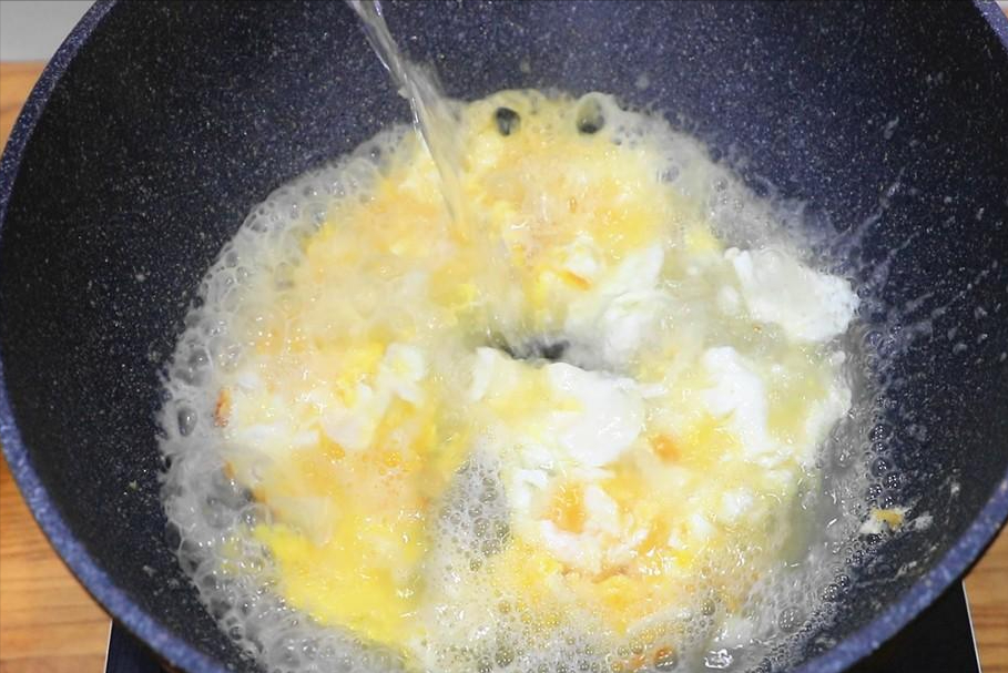 锅中烧一些油,油热以后把鸡蛋倒入锅中,用勺子轻推、晃动锅,让鸡蛋均匀受热,在鸡蛋没有完全凝固的时候倒入开水,加开水以及开大火烧开,煮出来的汤更加的浓白。