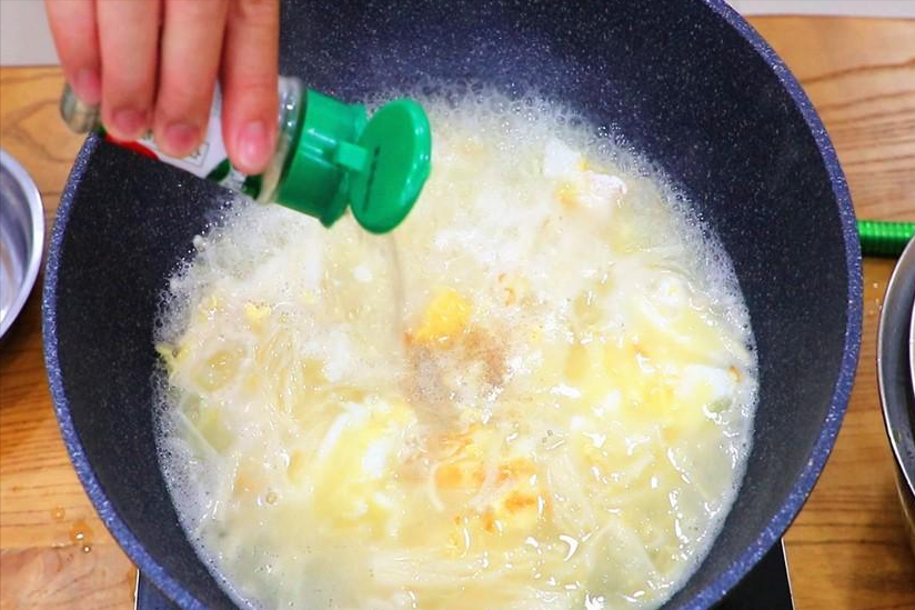 3.水烧开以后倒入金针菇,金针菇相比较其它食材比较难熟,要早一点放入。大概煮一分钟我们调一下味,加入适量的食盐、适量的胡椒粉即可,无需太多调料。