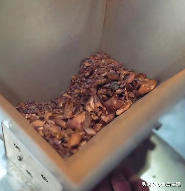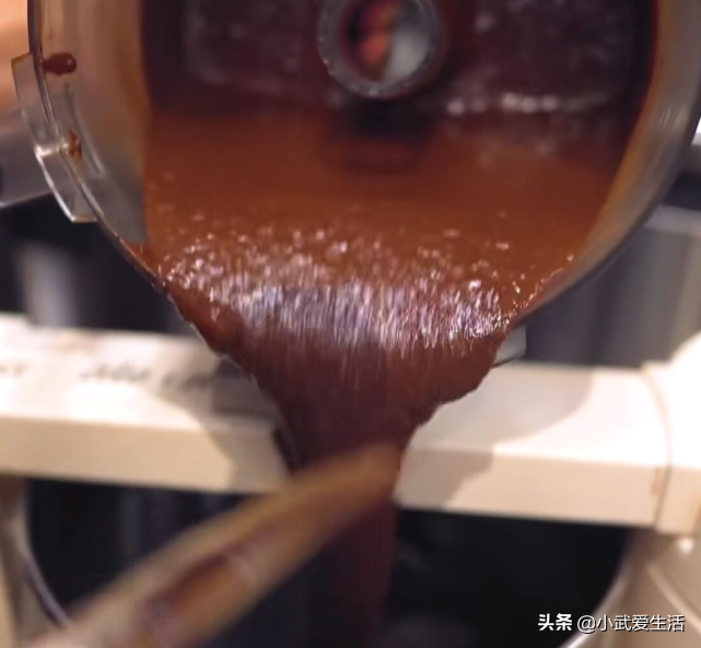 对于每一颗可可豆也有要求,个头不能太小了,而且也不能变质。所以有专门的人来筛选可可豆。筛选完成后就要把可可豆磨成粉末了,这个过程要进行多次,而且按照颗粒的大小还得用不同的机器,最后用的是最小的机器,把可可打成一份糊糊。即使是半成品,这样的可可看起来都是顺滑无比。