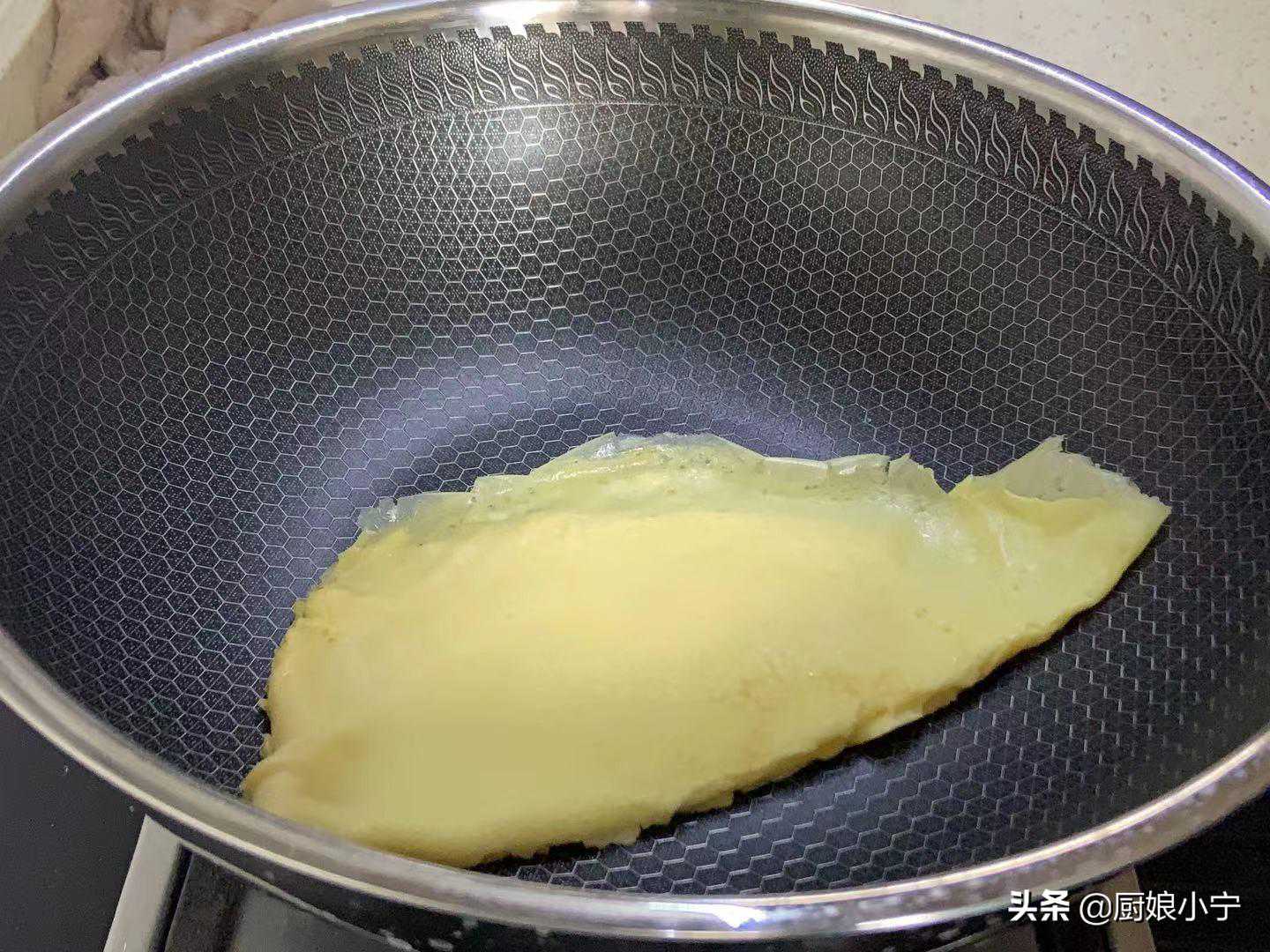 锅中少喷一点油,将蛋液倒入五分之四,碗中留少量蛋液备用。然后摇动锅,让蛋液铺开。这里要注意中小火操作,避免蛋液成熟太快,底部焦掉。