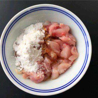 2、将兔肉剔除骨头切小粒,加入适量生抽、料酒、淀粉拌匀。
