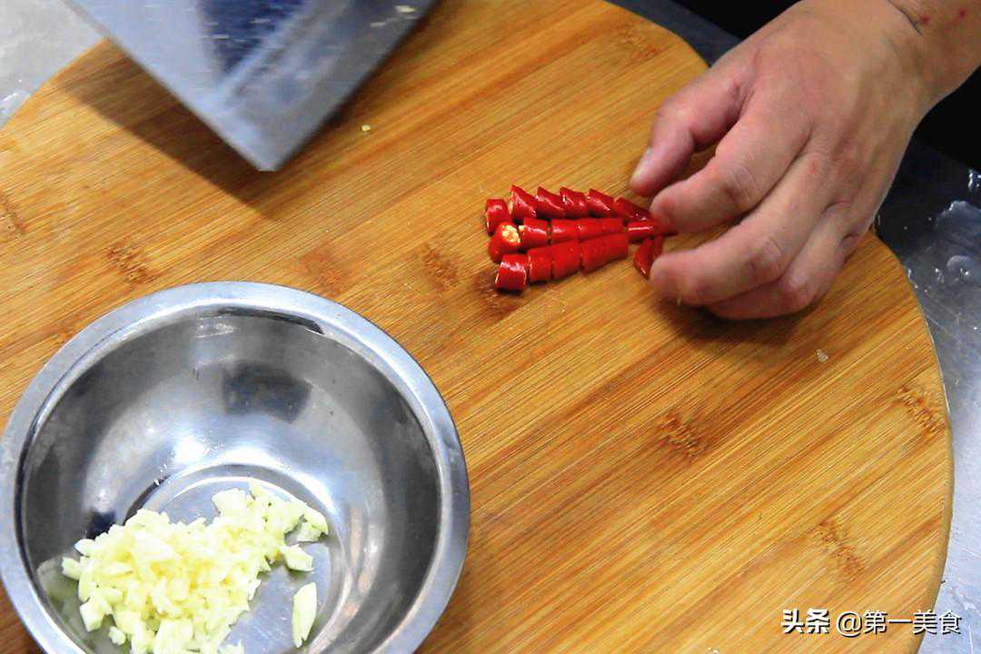3.大蒜拍扁剁成蒜末,小米椒3个切成辣椒圈放入盆内。