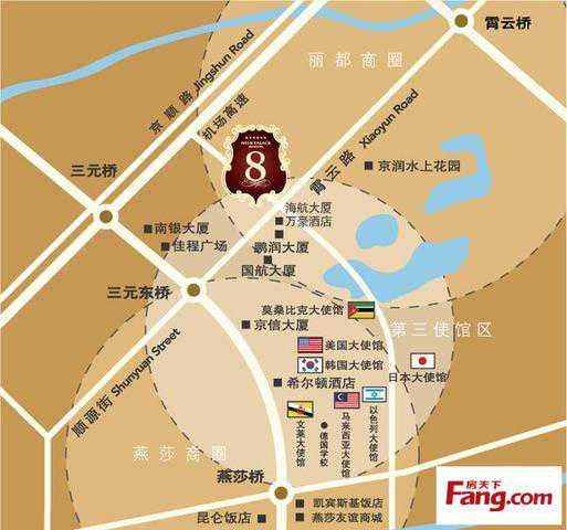 交通:10号线,机场线:三元桥站,三元桥站,地铁:10号线、机场快线三元桥站;公交:300、运通104、特8、730、725、825、731、302、831、367等十条线路在三元桥站下车均可到达,学校:小牛津双语幼儿园、中旅幼儿园、小牛津双语幼儿园,丽都国际小学,国际青年研修大学、司法行政大学,商场:联华快客(霄云路店)、燕莎友谊商城、京客隆曙光商场医院:北京国际医疗中心、北京市朝阳区新源里医院银行:农业银行、建设银行、中国银行、工商银行其他:希尔顿酒店、长城饭店、昆仑饭店、凯宾斯基饭店
