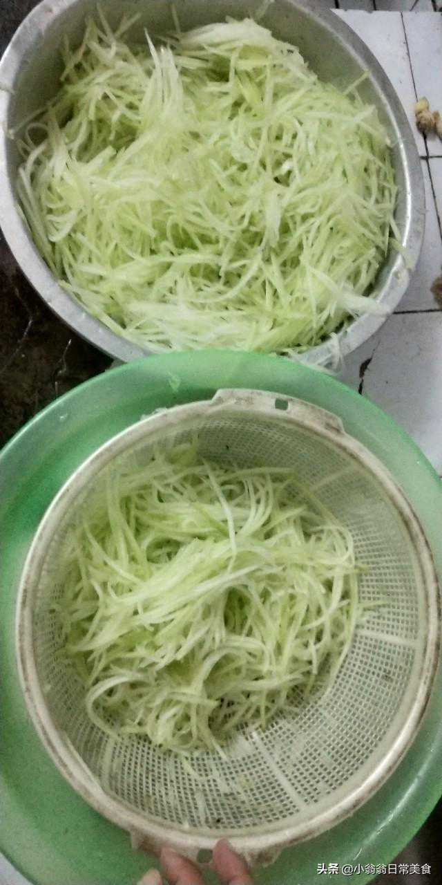 1.准备好三条冬瓜去皮去心,去心推成丝,然后捏干水分。