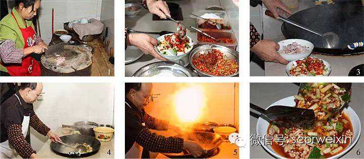 3.锅里放熟菜油和化猪油,烧至八成热便投入花椒炝香,等下猪肚头炒散籽时,倒入小葱白节等调辅料,用锅铲翻炒五六下后,端离火口置于锅圈上,接着再用锅铲翻炒三五下,即可出锅装盘(见图3~7)。
