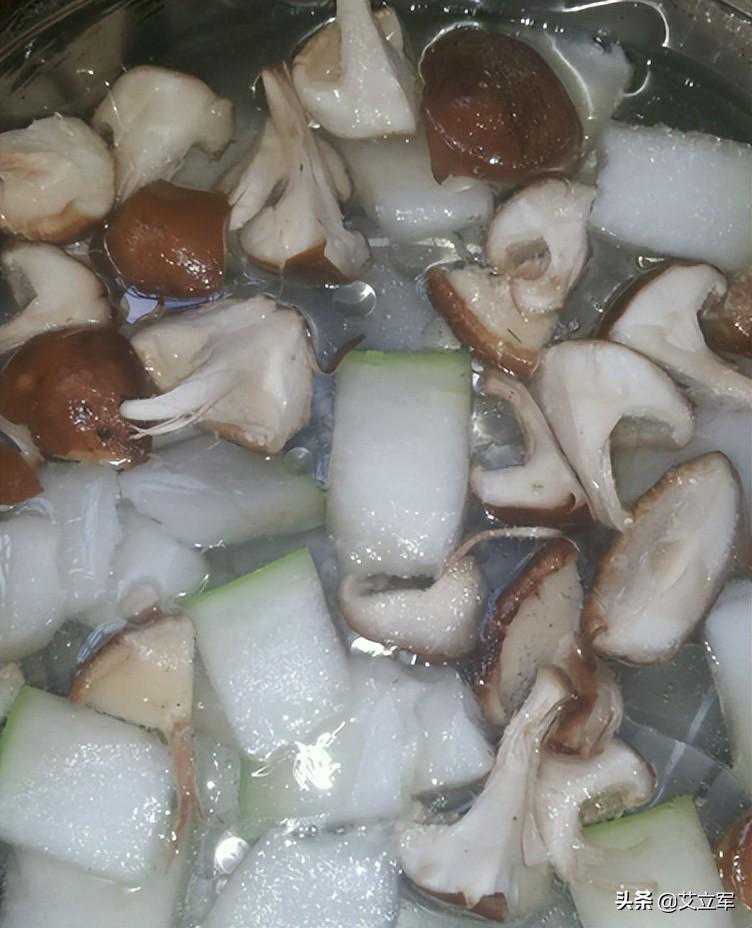 第三步:将冬瓜煮至快软时下冬笋片、冬菇片煮熟,加入精盐调味起锅,入汤盆上桌即可。