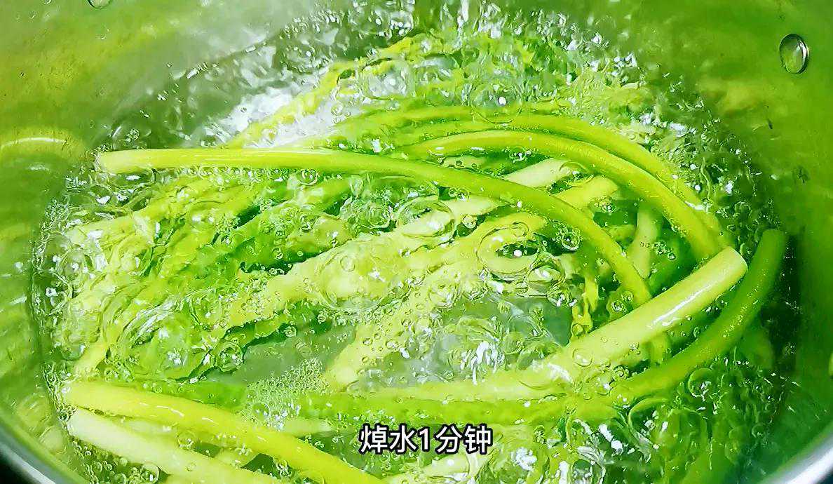 1.把蒜苔从中间切断,锅里加水烧开,把切好的蒜苔放进去,焯水一分钟,不能多不能少,只有这样,才能在去掉蒜苔生蒜味的同时保证它的脆爽口感。