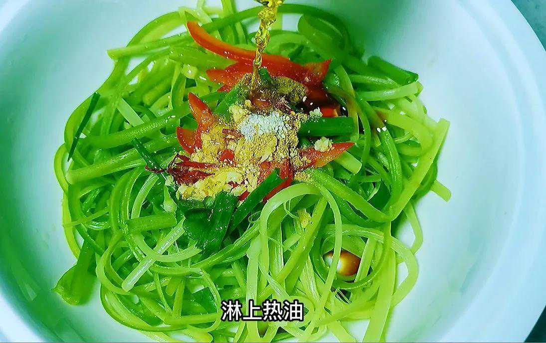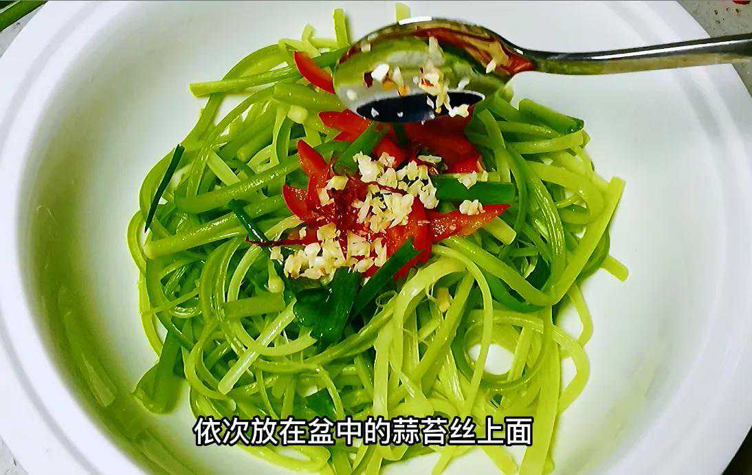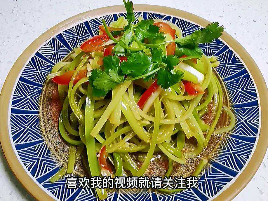一道青翠欲滴的凉拌蒜苔丝就做好了,是不是很简单?但是这道菜吃起来却不一般:尝一口酸甜怡人,嚼一嚼脆爽可口,一盘子不一会儿就一扫已空了!