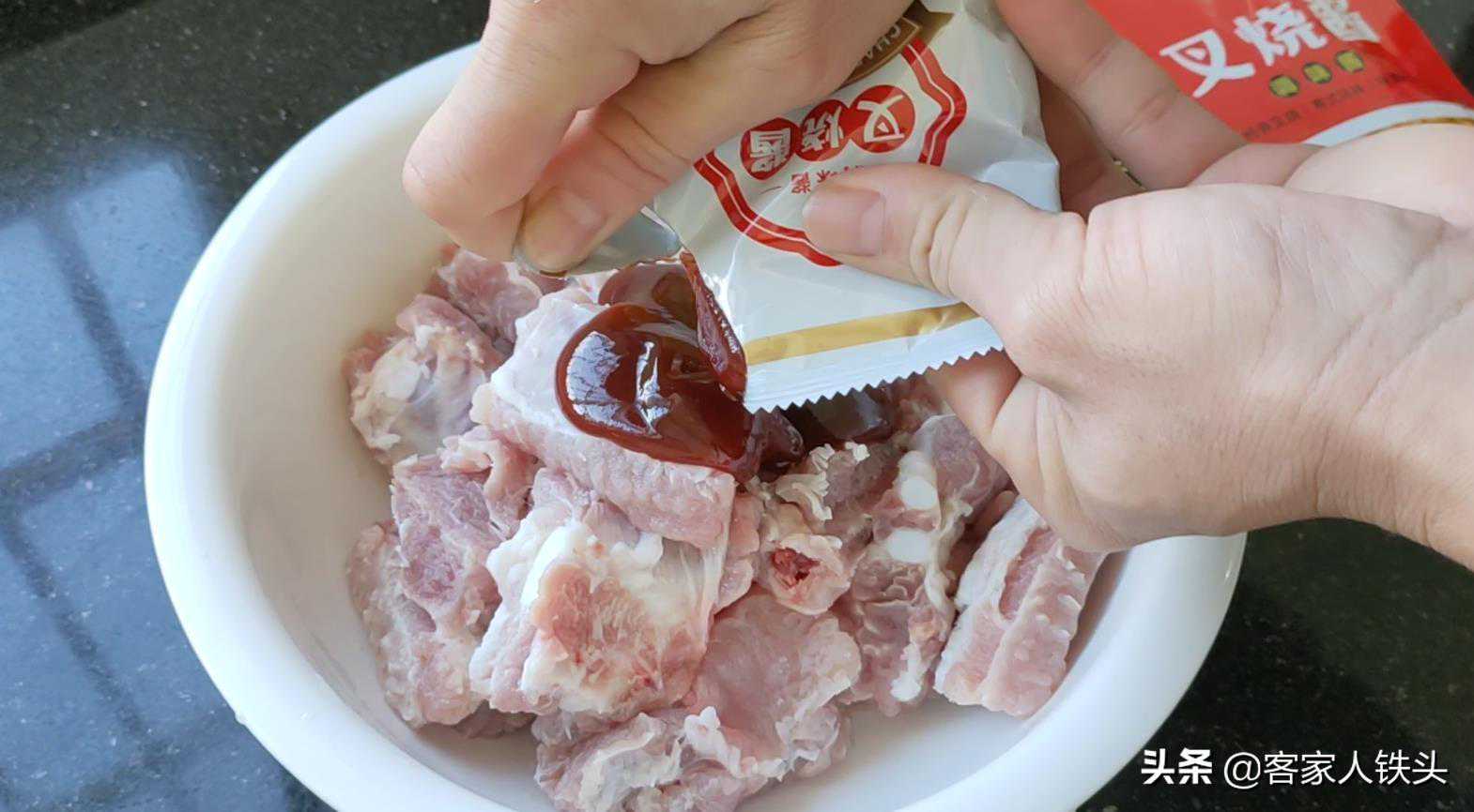 第二步:排骨的血水泡出后,还要用手抓洗几遍,把排骨洗至偏白色,再抓干水分放到大碗中,加入一包叉烧酱,大概80克左右,每个人的口味不一样,大家按自己喜欢的口味来加料,另外再加上一小勺的蜂蜜,用手把排骨抓拌均匀就可以了。