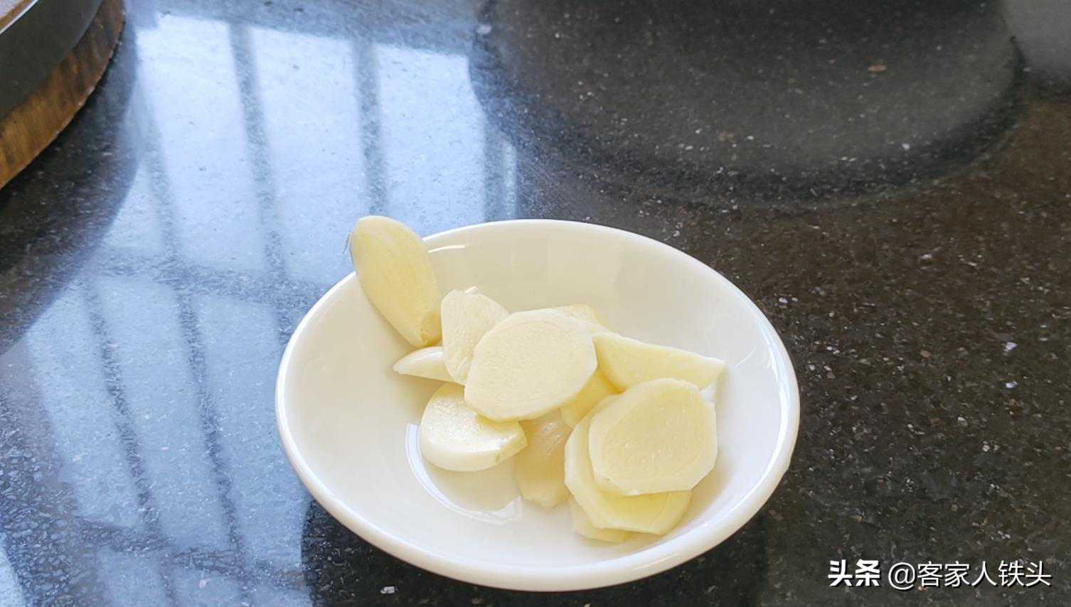 第四步:待排骨腌制得差不多时,准备一块姜去皮,蒜头3瓣也要去皮,把它们清洗干净后,再切成薄片,放在一边备用。