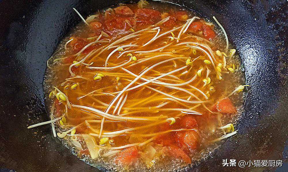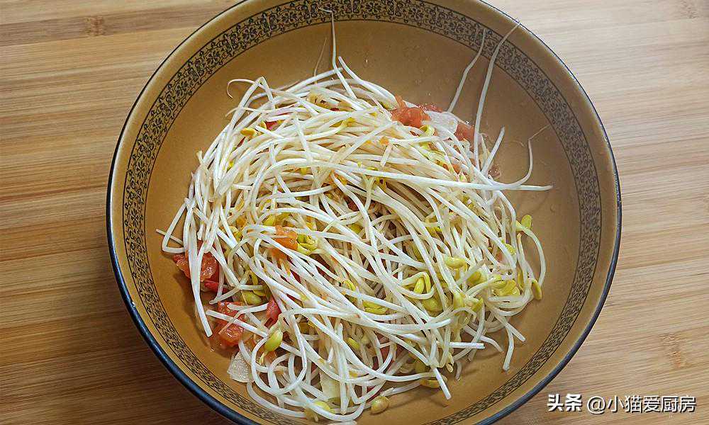 【步骤七】:西红柿炖煮5分钟,把豆芽下入锅中,烫煮2分钟,然后捞出来放入大碗中。