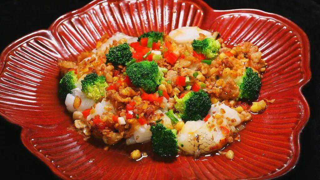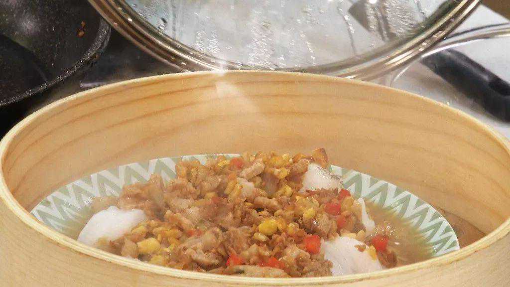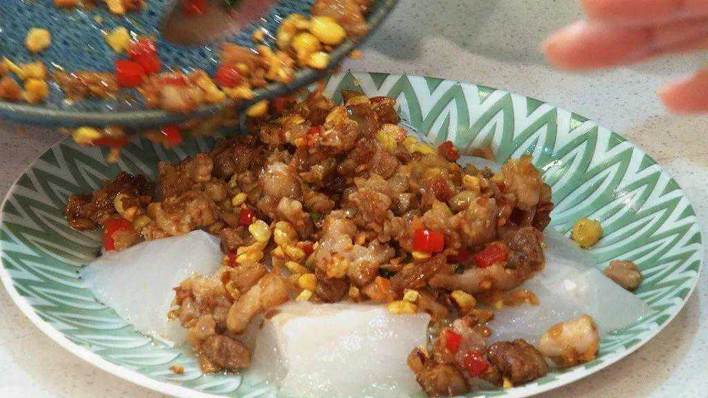 步骤4:将鳕鱼放在盘中,淋上炒好的冬菜五花肉和豆酥,上蒸锅大火蒸5-6分钟即可。