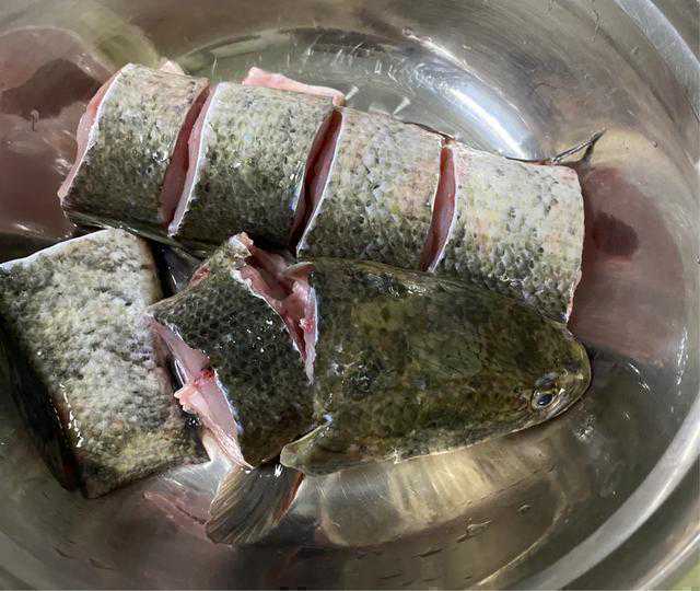 1把黑鱼切成一段一段的,排在盆里。