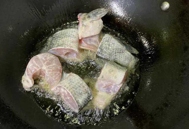 4把裹上淀粉的鱼块下油锅,两面都煎一下。