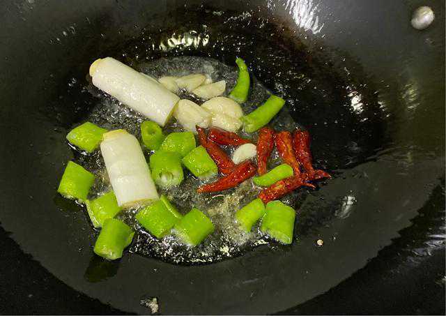 6锅里放进生姜,葱,蒜,辣椒炒出香味。