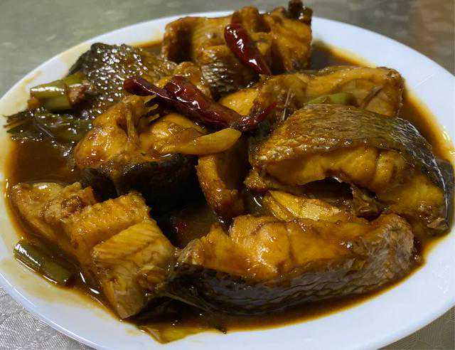 10红烧黑鱼块就烧好了,可以装盘了。真香啊!入口,汤汁外甜里辣,汤汁下面鱼肉鲜嫩爽哇老公立刻打开一罐啤酒!