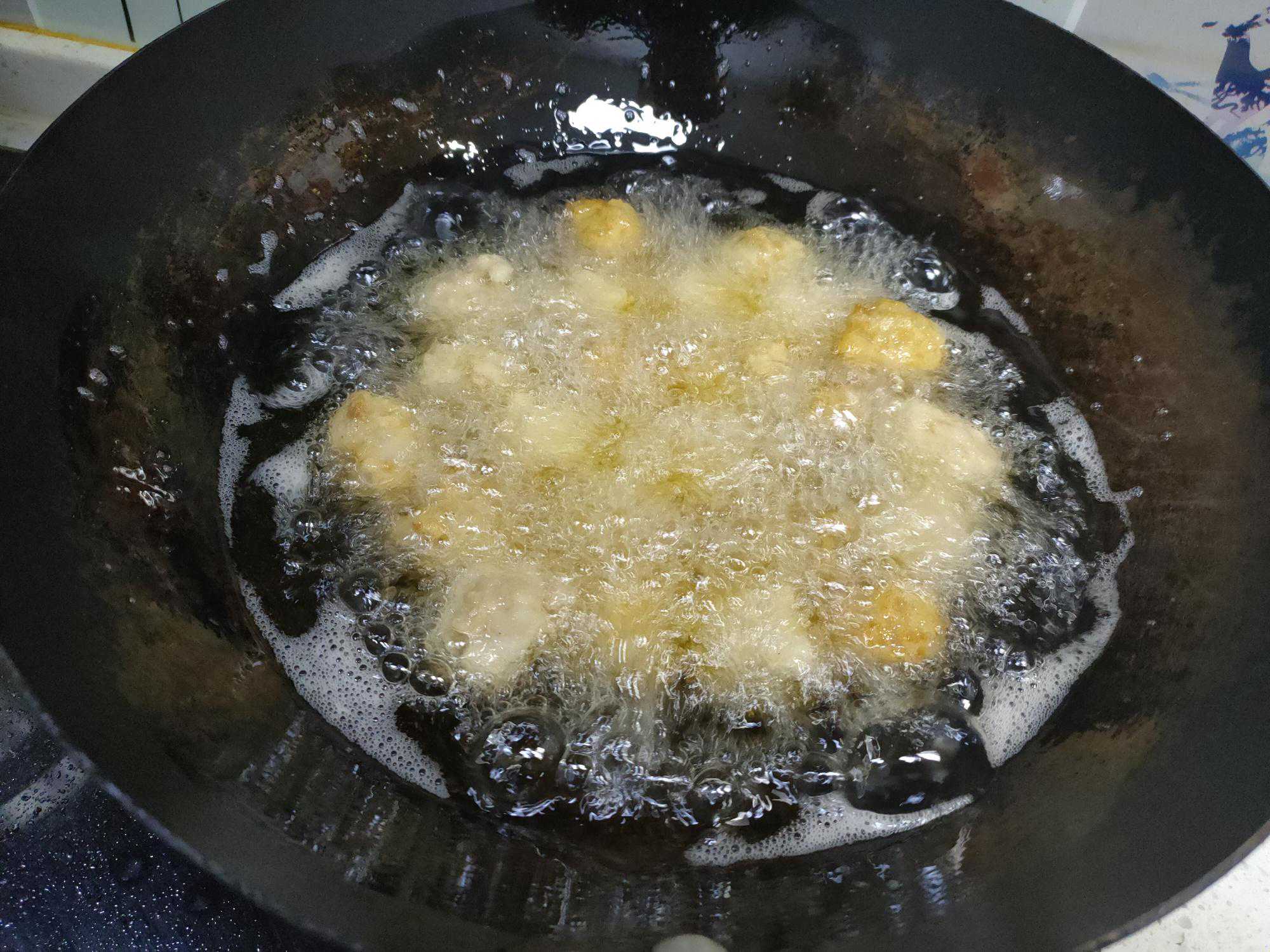 6、油温烧至六成把丸子下锅复炸一遍,复炸的时间在15秒左右,把丸子炸酥、炸至颜色金黄后捞出。