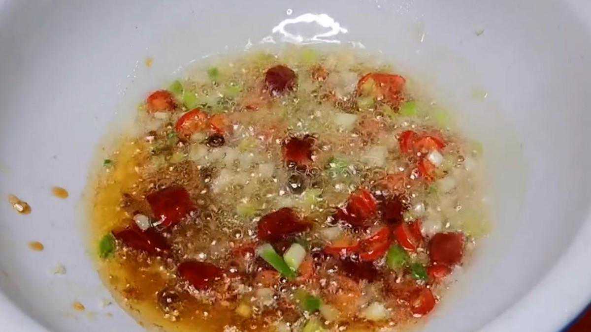 泡洗干净的丝瓜尖,根和尖分开放,锅里倒少许植物油,烧至八成热,倒入小料碗中,激发出香味。