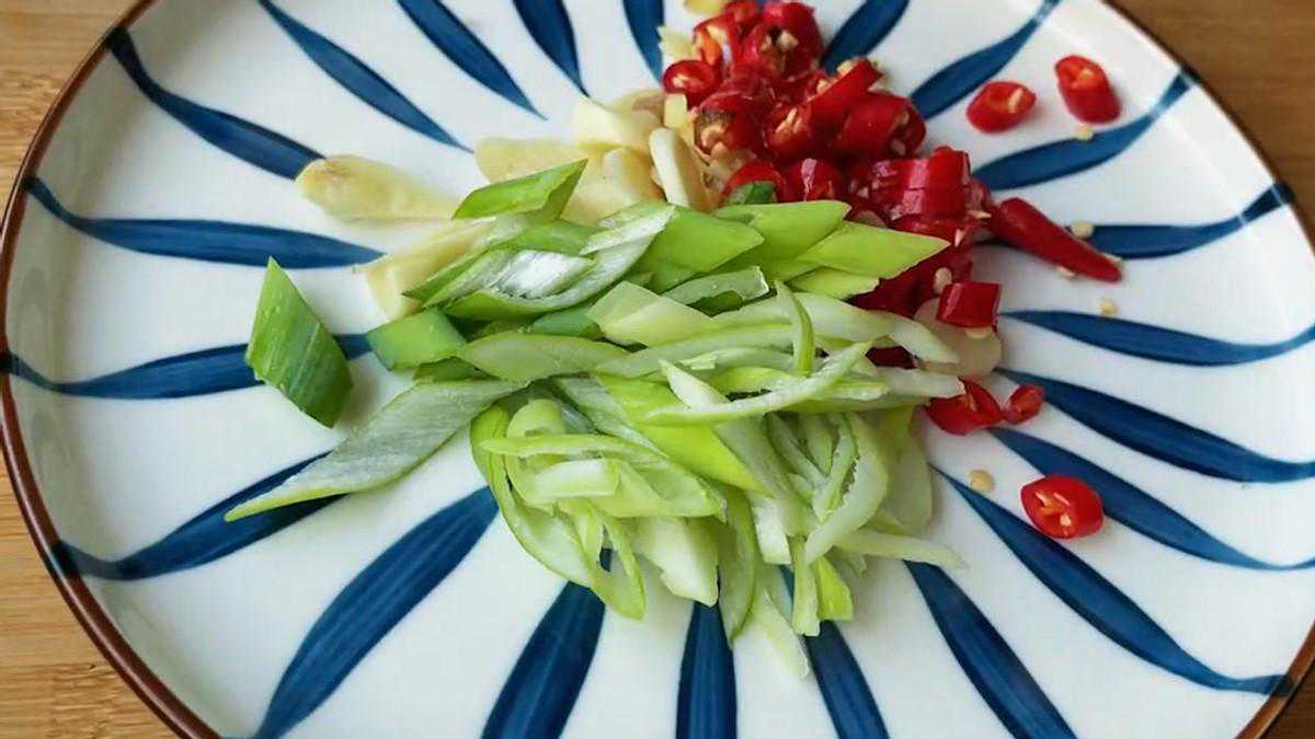 再来切点配菜,葱切成丝,蒜切片,把姜切成末,再来切几个小米椒切成圈,切好放入盘中备用。